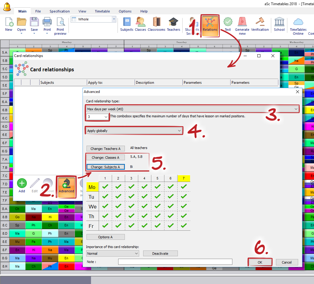 2. However the above rule will consider as a gap only a space between the two lessons on the same day. So if Biology is on different days in 5A and 5B the software doesn't consider this as a gap. So you will need to add second cardrelationship that will force the lessons into the same day(s):
