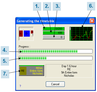 1. progress bar shows the total number of cards in the timetable. It also shows how many cards the software was unable to put into the timetable. If the generation algorithm was not able to put some cards into the timetable the color of this bar changes and the total number of unplaced cards is shown. For example 3/768. The generation continues, however you might consider to stop it, try again and/or relax some constraints.