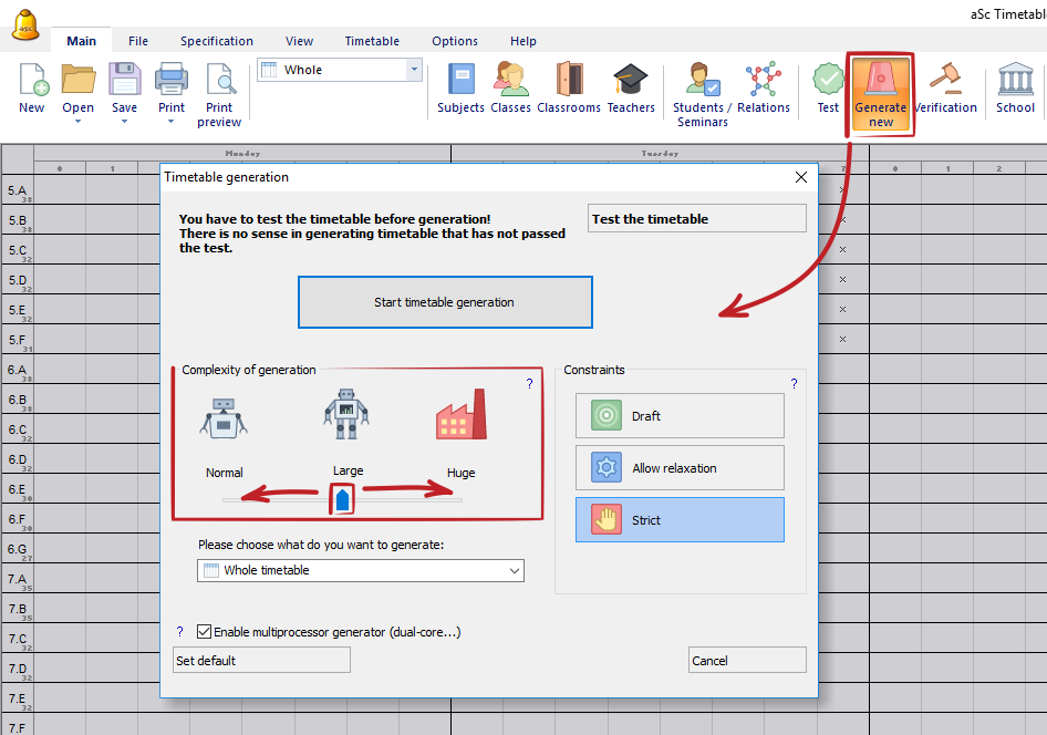- It is not a good idea to use large and huge settings before you are quite convinced that there are no mistakes in the basic data and you have inputted realistic constraints. See also: Analyze the timetable by Extended tests