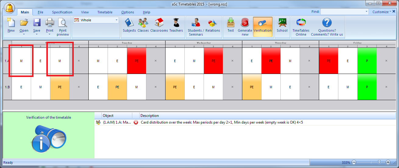 This was an easy example. In real life if you block many teachers on many days, the timetable can get so twisted you will have no idea what can be wrong.