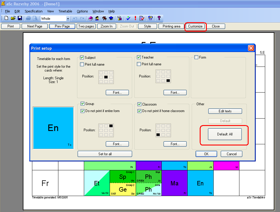 The software allows you to change the texts in the printed timetable. This helps in some special cases when you want different texts printed in the timetable then the original one. For example Grade5 instead of 5A/5B/5C.