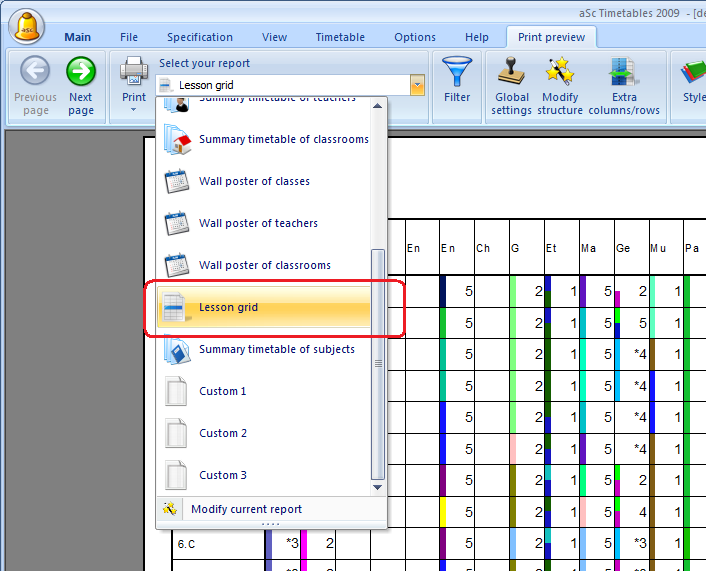 Then select the Print lesson grid from the list of available printouts: