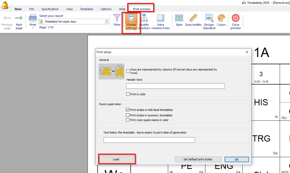 Can I load a custom printout settings from another timetable?