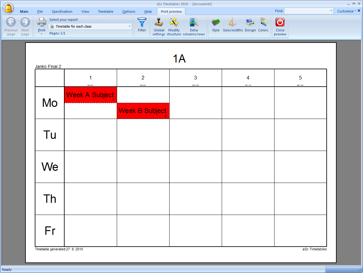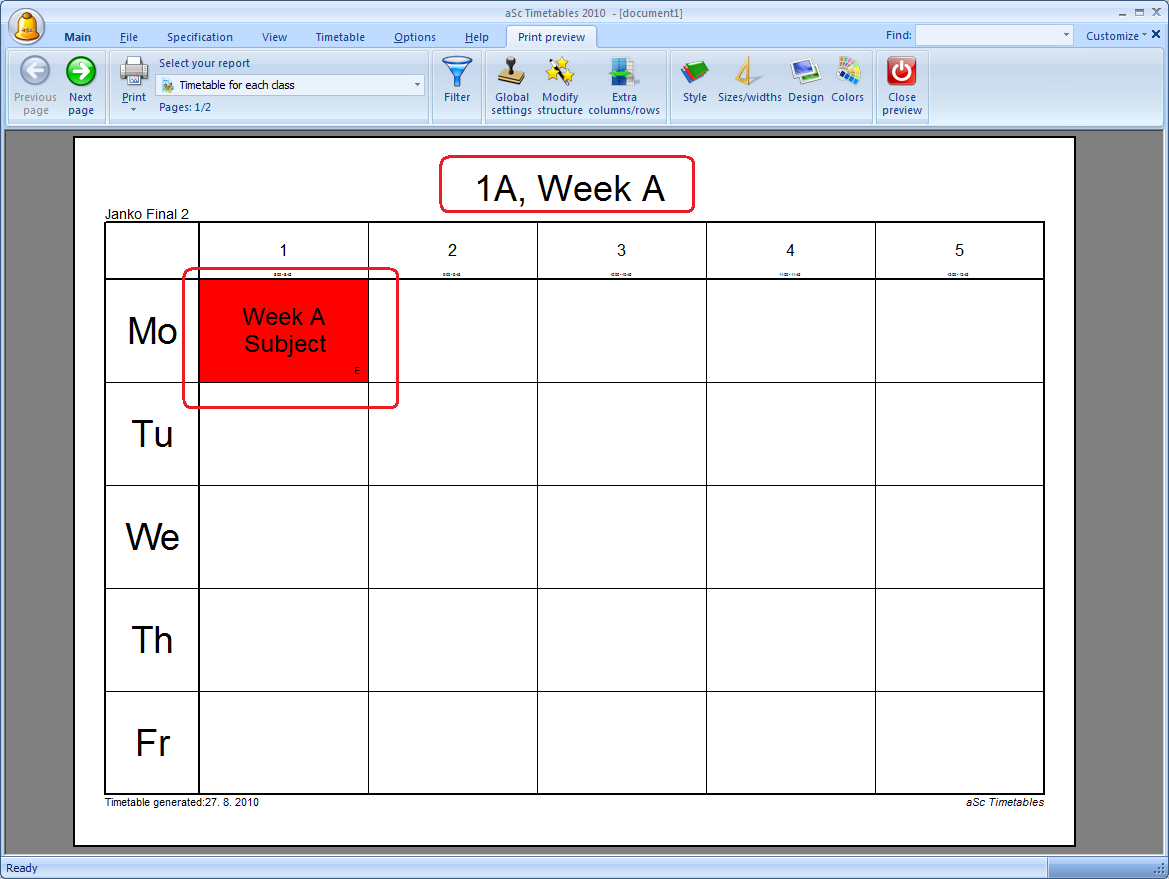 By default the software prints the two weeks (or two terms) timetable on one sheet, with the row divided into weeks (terms). Top part of the row shows week A, bottom part shows week B: