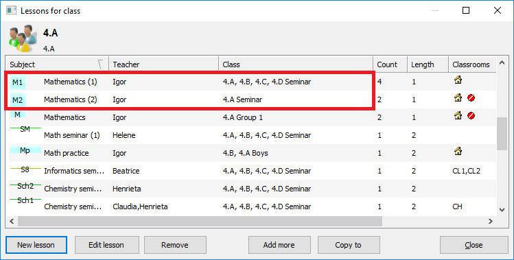 Special situation is when you have two seminar lessons from same subject in one class. Program understands this as that these two lessons are equal. If student attends this subject, it does not matter to which from these two lessons will he belong (but he can belong to only one). This is used usually when many students want to attend one subject, so they need to be divided into groups.
