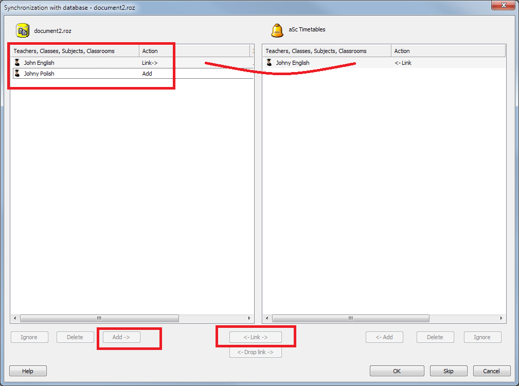 Now if the teacher's, subjects are named the same in both files the software will automatically link these. If ther are named differntly, you will be able to specify if a new object shall be added or you can select one of the existing objects to link with: