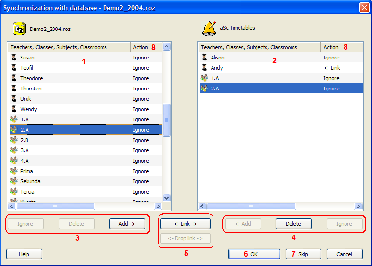 Dialog shows differences between data (teachers, classes, etc...) in aSc Timetables and database. Left list 1 shows data in database that is not in aSc Timetables, or that is in aSc Timetables, but is somehow different (e.g. different name, short name, etc...). Right list 2 shows data that is only in aSc Timetables, or that is different in aSc Timetables than in database. Your task here is to review or change actions 8 for each row in both lists. You can do this by clicking on buttons below. Buttons 3 will change action in database list 1 and buttons 4 in aSc Timetables list 2. Buttons 5 apply for both lists (you need to select one object in each list).