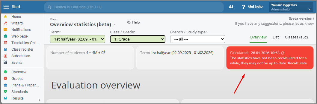 If the data in the statistics has not been recalculated for a longer period of time, the system will display a warning indicating that the statistics need to be recalculated.