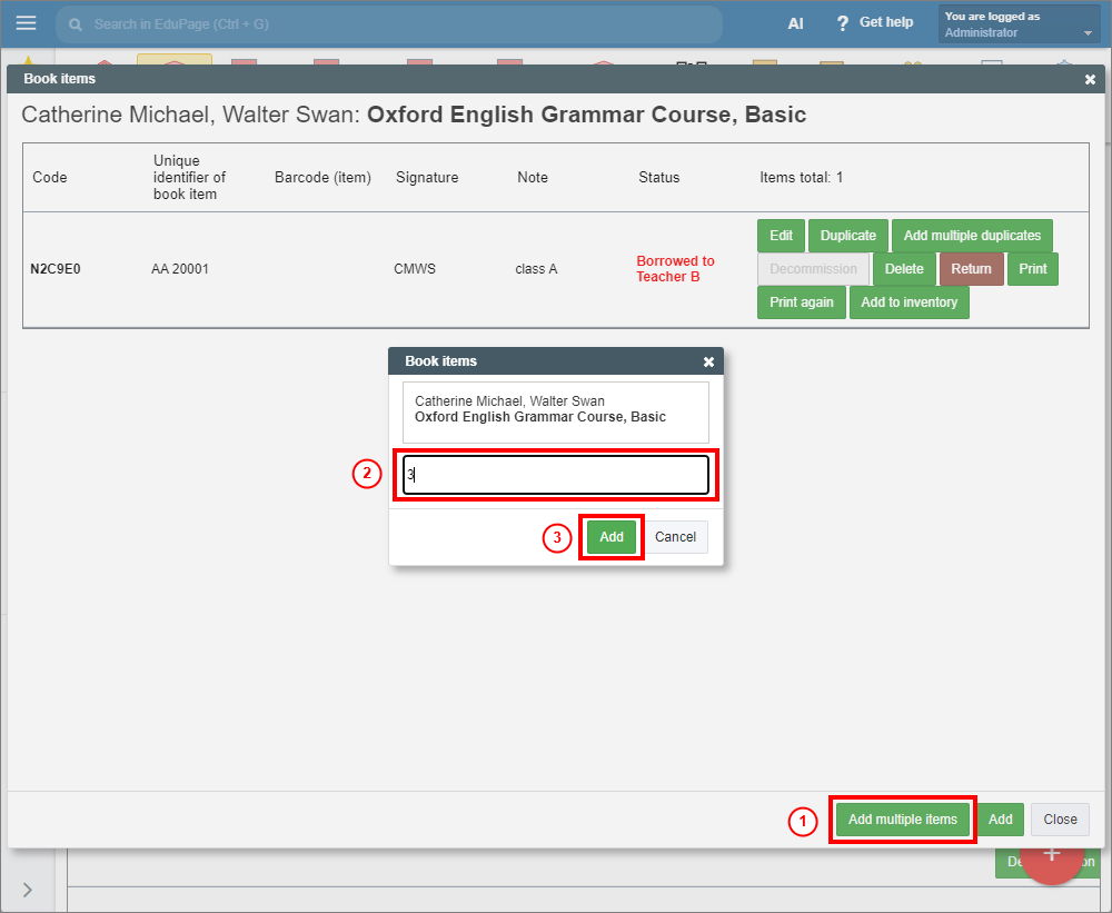 In the Book items window enter the number of desired copies and click “Add” to confirm.