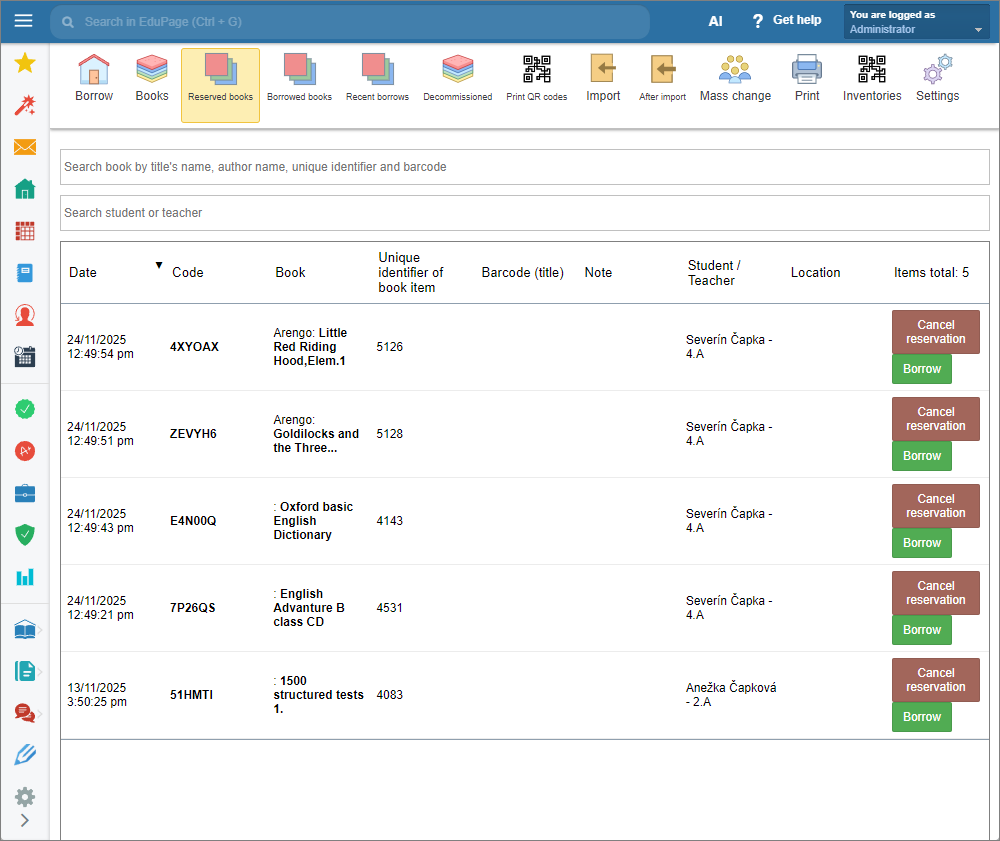 In the “Reserved books” tab, you can view the books that have been reserved by users. You can also search the list using the selected criteria.