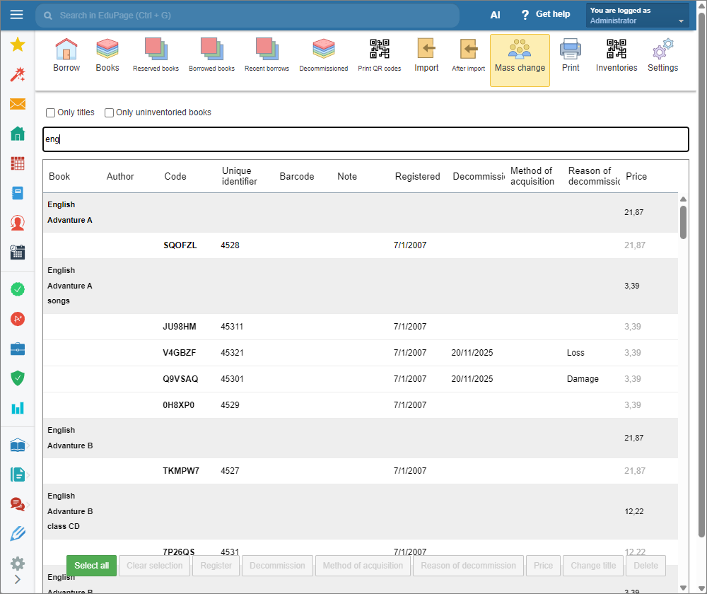 In the “Mass change” tab, you can bulk-edit the items’ properties or bulk-delete the titles.