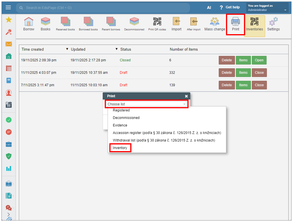 If the book item that has already been recorded in the list is later decommissioned or deleted, it will remain in the inventory record with information about its status.This information will be displayed even after the inventory record is closed.