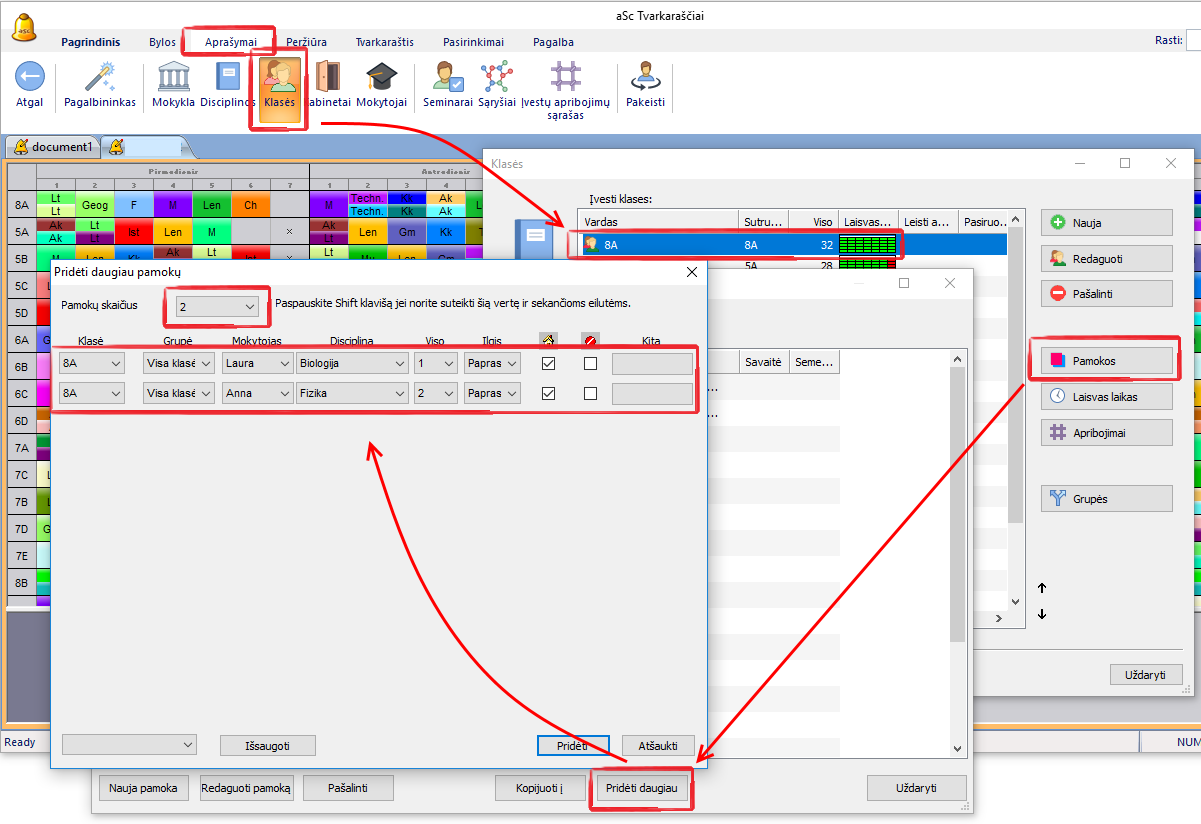 Jeigu daug klasių arba mokytojų turi panašias pamokas, jas klasei/mokytojui galima pridėti vienu kartu. Paspauskite mygtuką „Pridėti daugiau“ ir laukelyje lango dešinėje (viršuje, vadinasi „Pamokų skaičius“) nurodykite, kiek pamokų norite pridėti.