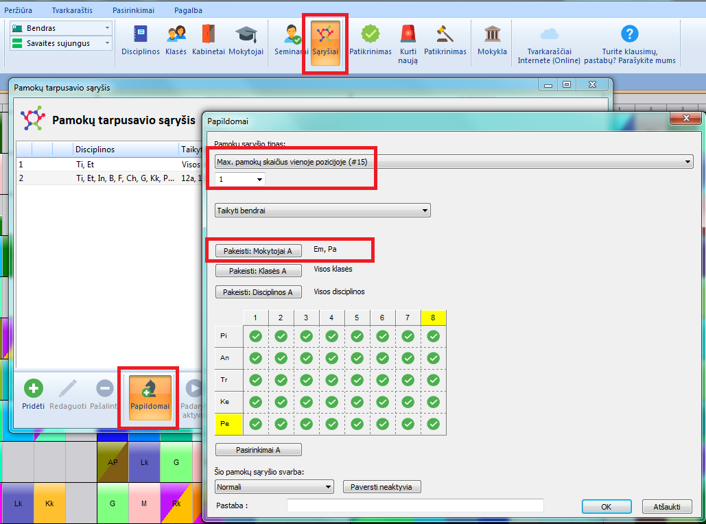 Tačiau jeigu yra du nepriklausomi mokytojai ir jums tikrai reikia, kad jie neturėtų pamokų tuo pačiu metu, galite įvesti tokią papildomą pamokų sąryšio sąlygą, kuri leidžia parinktiems mokytojams įdėti tik vieną pamokos kortelę į vieną poziciją: