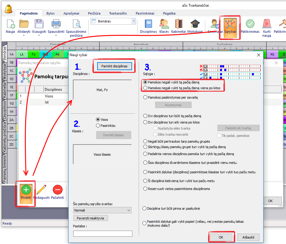 Jūs galite užduoti pamokų tarpusvio sąryšį, kad dvi pamokos negali vykti tą pačią dieną arba negali vykti tą pačią dieną viena po kitos: