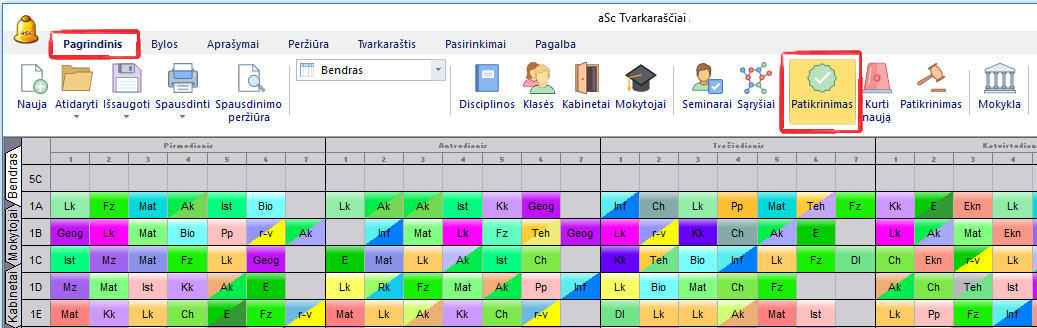 Šią funkciją galima pasirinkti komanda "Tvarkaraštis, Patikrinimas" - bus paleistas algoritmas, kuris pamėgins sukurti ir patikrins atskiras tvarkaraščio dalis.