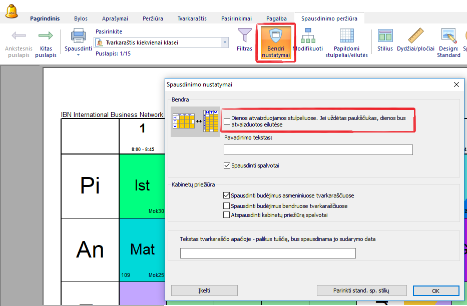 Programa individualius klasių, mokytojų, kabinetų tvarkaraščius spausdina taip, kad dienos yra eilutėse, o pamokos (pamokų laikas) stulpeliuose.