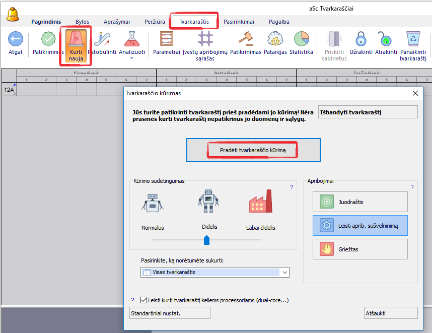 Įrašius mokinių pasirinkimus ir įvedus seminarų grupes, galima sukurti tvarkaraštį - pasirinkite "Tvarkaraštis, Kurti naują, Pradėti tvarkaraščio kūrimą":
