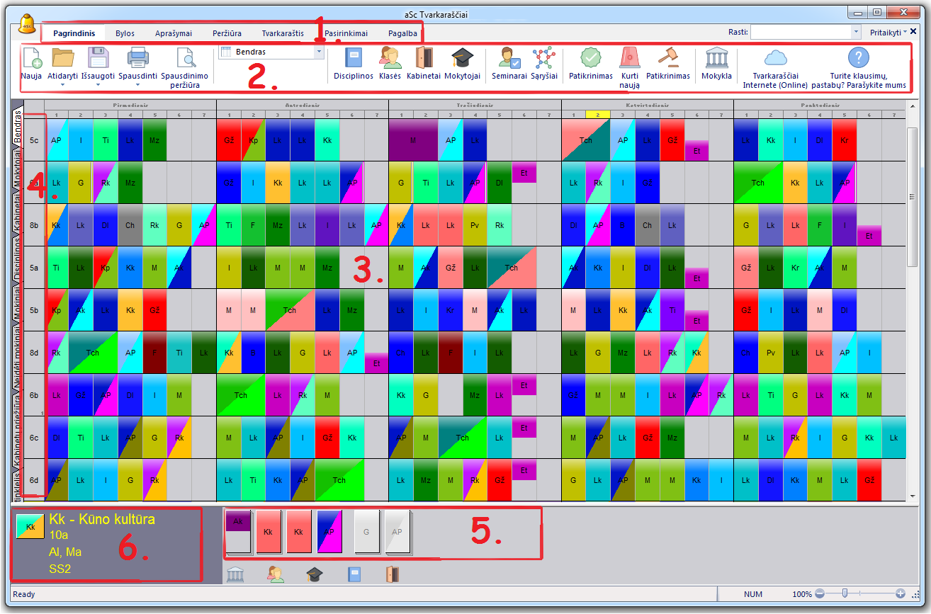 4 - Eilučių pavadinimai. Paspaudę juos, galėsite pasirinkti klases, paspaudę dešiniu pelės mygtuku galėsite pasirinkti lokalaus meniu komandas.