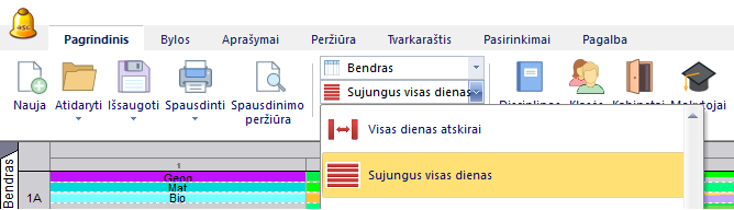 Jei naudojate ir semestrus, galima pasirinkti "Rodyti semestrus atskirai", tuomet kiekviename stulpelyje bus atskiras semestras ir jame visos dienos bus sujungtos, o stulpelis bus padalintas į pamokų numerius.