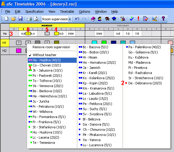 תפריט קופץ יציג את כל המורים הזמינים עבור השגחה במהלך זמן זה. רשימת המורים ממוינות, כך המורים הטובים ביותר לביצוע ההשגחה מוצגים ראשונים. ריבועים צבעוניים (סימן 1) מציינן לך מידע על השיעורים של המורה לפני ואחרי זמן ההשגחה. ריבוע ירוק אומר שהמורה מלמדת בכיתה הסמוכה, ריבוע כחול שהוא מלמד בכיתה אחרת. ריבוע משמאל מציין שהשיעור לפני, ריבוע מימין מציין שהשיעור אחרי. ריבוע אדום (סימן 2) מציין שהמורה עושה השגחה בחדר אחר בזמן הזה. המספרים אחרי השם של המורה מציינים כמה השגחות הוקצו למורה הזה עד כה (זמן בדקות / מס ההשגחות).