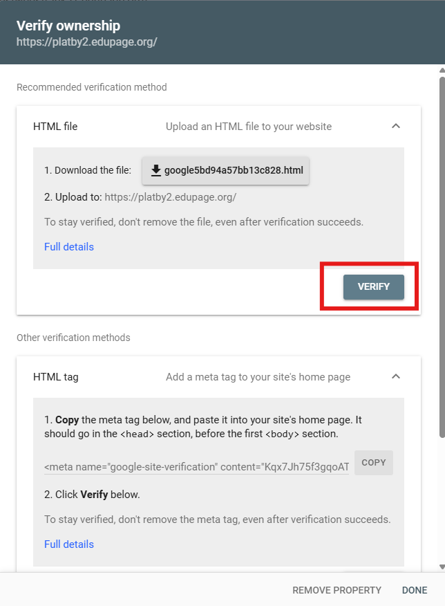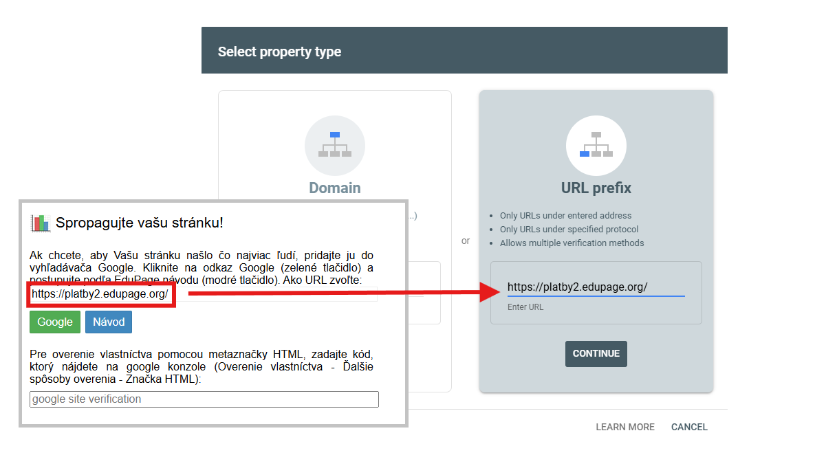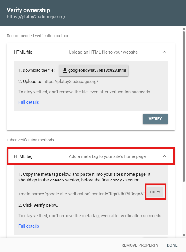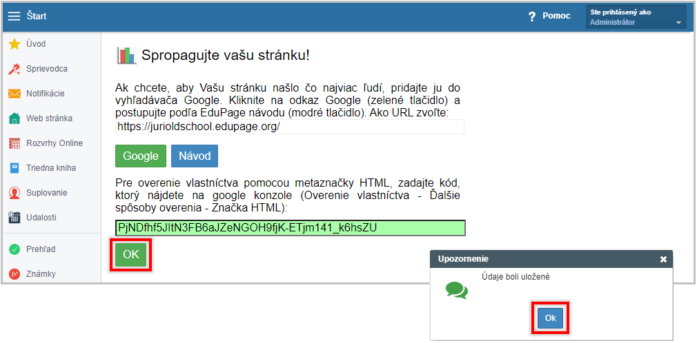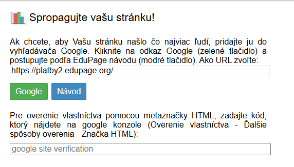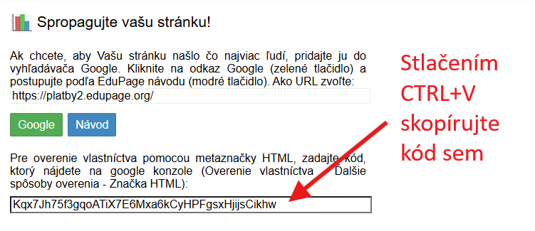 Overenie vlastníctva realizujeme cez značku HTML. Skopírujte metaznačku z google konzoly a vložte ju do políčka "google site verification" v EduPage.