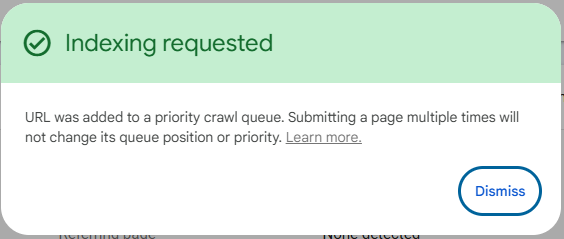 Zobrazí sa okno "Indexovanie bolo vyžiadané" a potvrdíte zakliknutím "Dobre (Dismiss)".