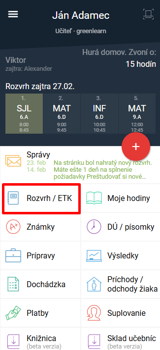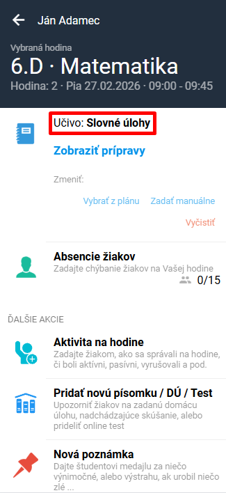 Učiteľ v triednej knihe vyberie učivo z plánu.