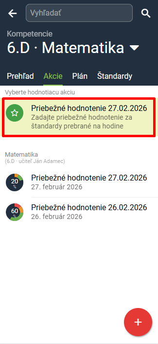 Vyberte pohľad Akcie a kliknite na priebežné hodnotenie. Zobrazí sa štandard/štandardy danej hodiny.