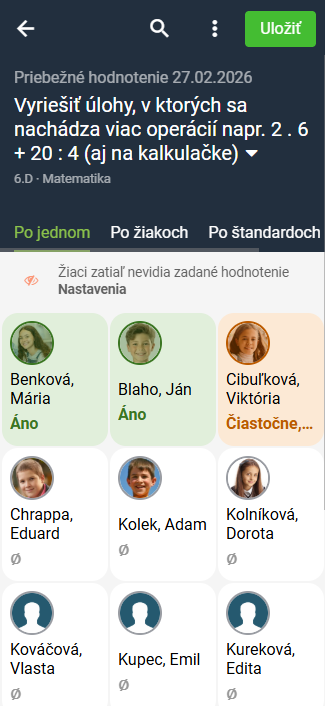 Hodnotenie zadáte kliknutím na ikonu žiaka. Opakovaným klikaním sa menia možnosti hodnotenia podľa toho, aký spôsob hodnotenia máte nastavený.