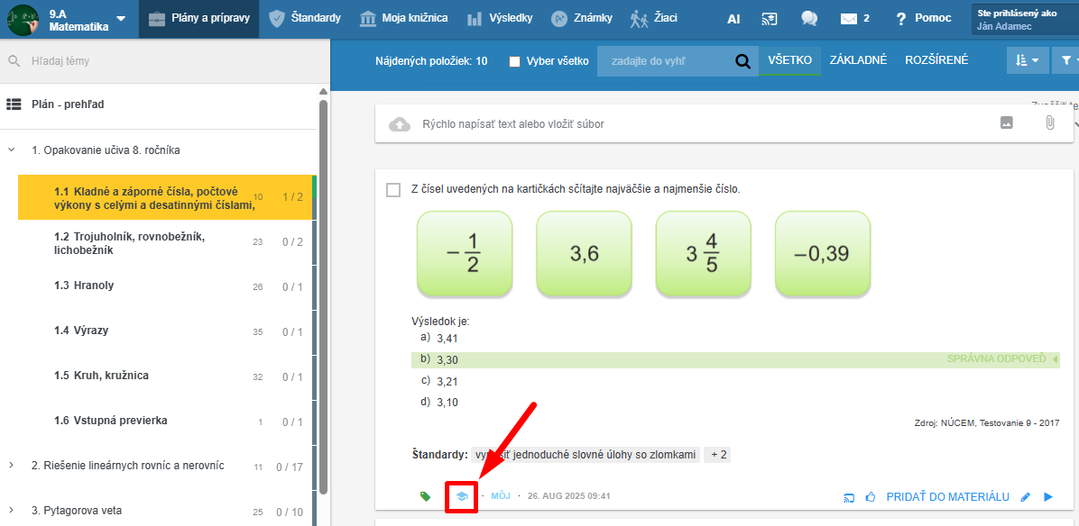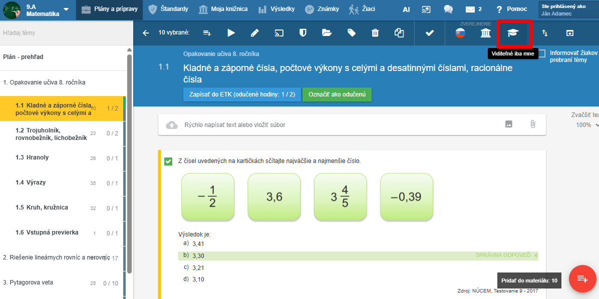 Zvoľte "Ikonu viditeľnosti" na materiáli, ktorý chcete urobiť viditeľným/neviditeľným pre žiakov.
