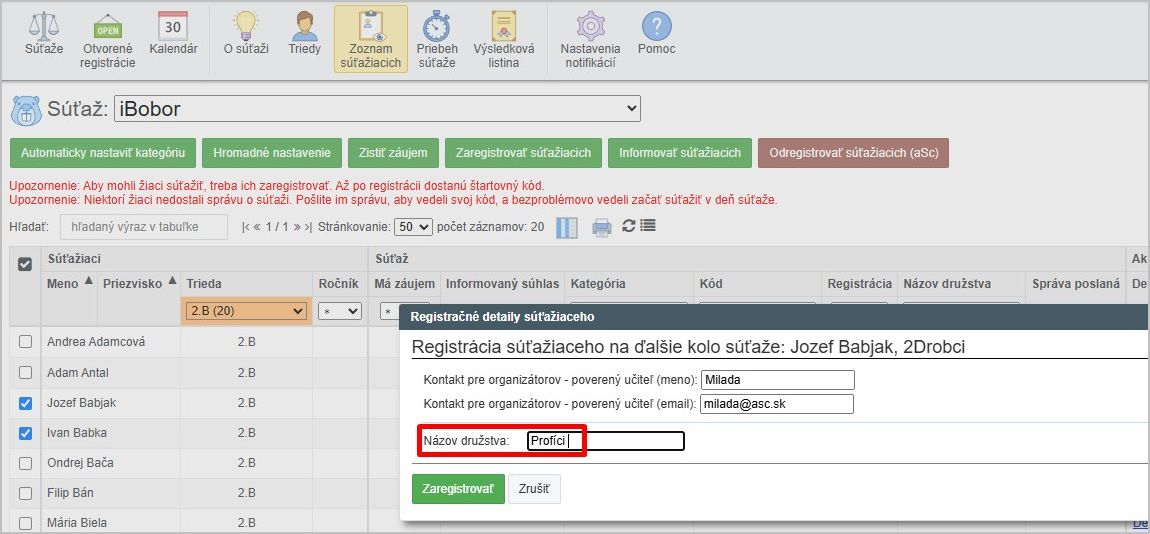 V module Súťaže v časti Zoznam súťažiacich označte dvojicu žiakov.
