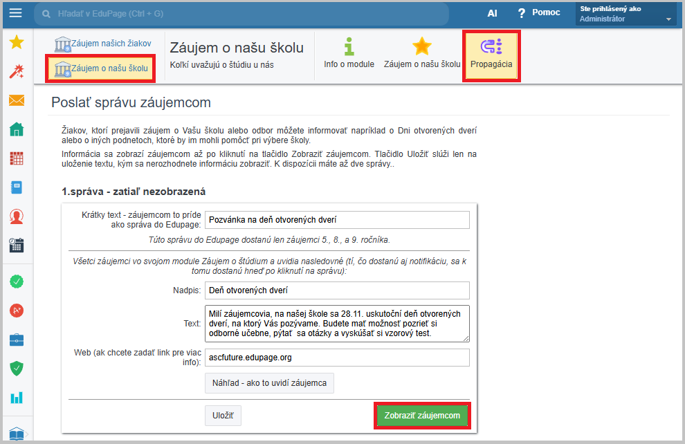 V module Záujem o štúdium v hornom menu vyberte Záujem o našu školu/Propagácia.