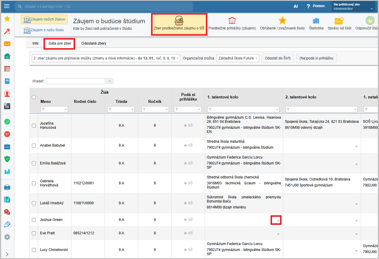 V riadku žiaka, ktorému chcete zadať záujem kliknite na plus a vyberte školu.