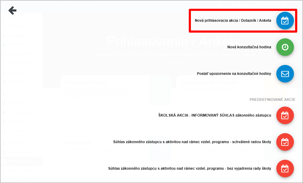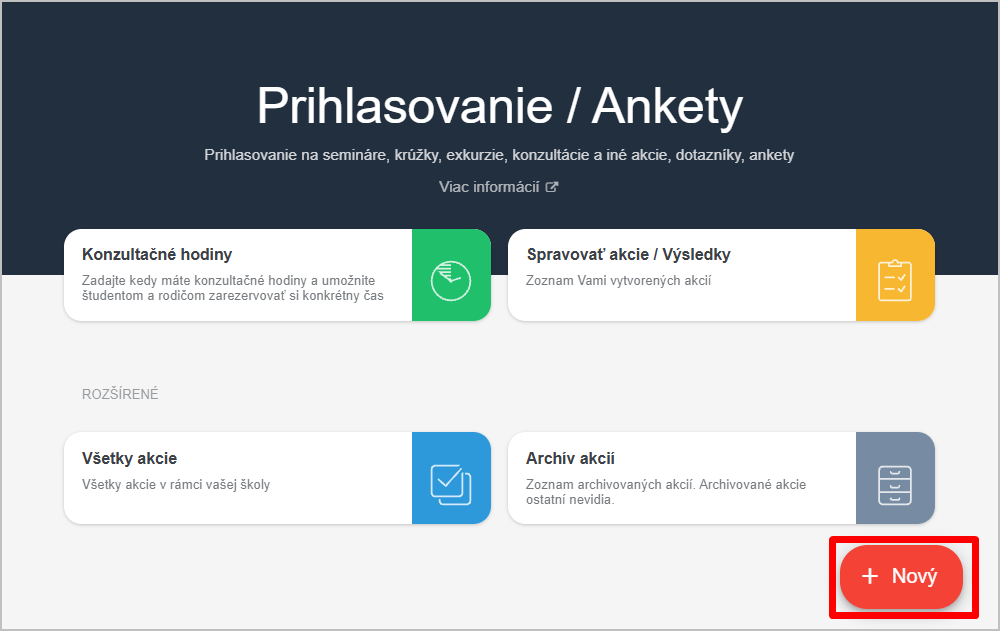 Novú prihlasovaciu akciu vytvoríte stlačením červeného tlačidla +