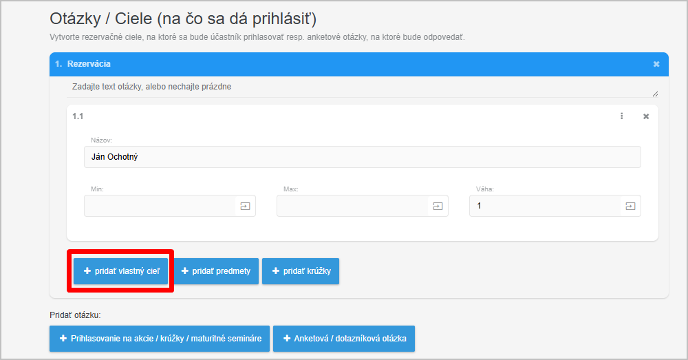 Každý kandidát je jeden "cieľ". Nový cieľ pridáte stlačením tlačidla "Pridať vlastný cieľ".
