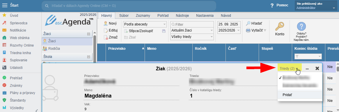 Žiaka nanovo nevytvárajte, v jeho karte kliknite na Triedy.