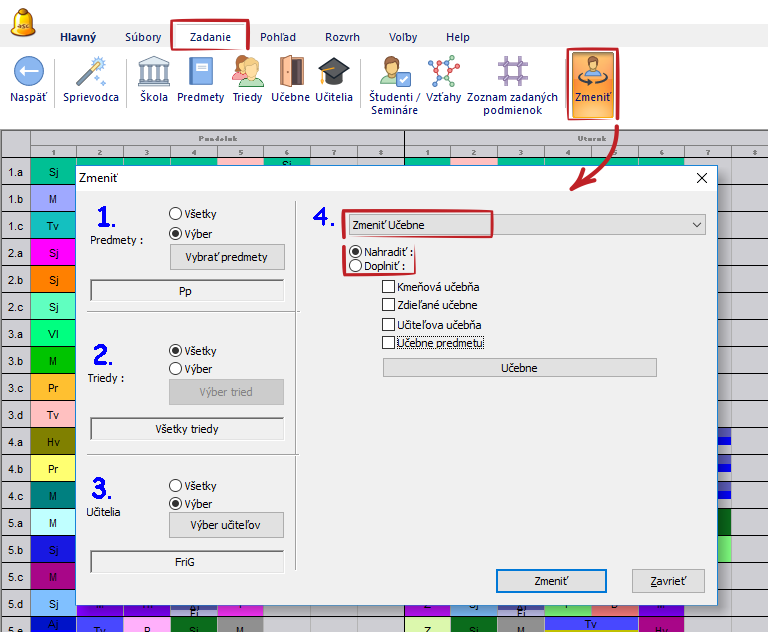 Cez menu Zadanie - Zmeniť môžete zmeniť alebo upraviť povolené učebne pre viac (alebo všetky) hodiny naraz.