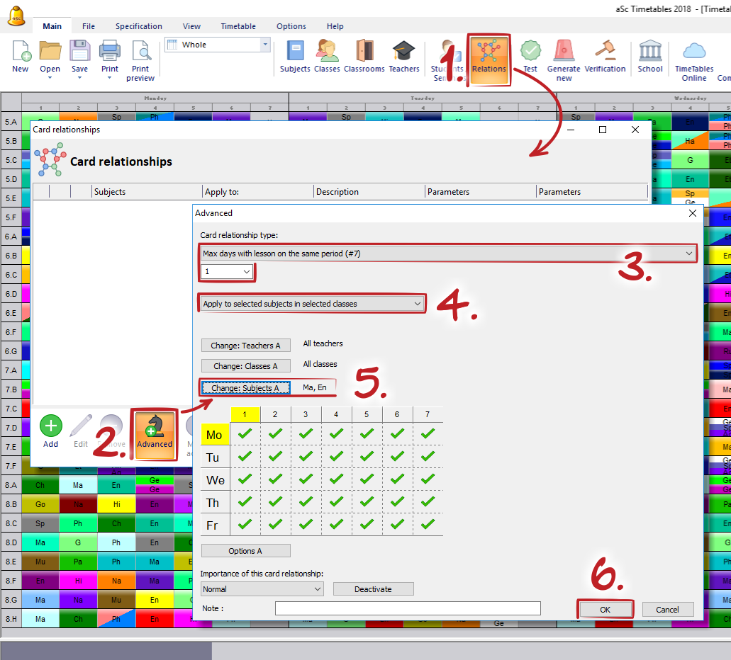 Obrázok zobrazuje dva predmety v tom vzťahu medzi kartami. Avšak keďže sme zadali "Aplikuj na vybrané predmety vo vybraných triedach", potom s každým predmetom sa zaobchádza samostatne v každej triede. Takže je potrebné zadať iba jeden vzťah medzi kartami, aby ste povedali, že počas týždňa má byť iba jedna hodina matematiky a jedna hodina angličtiny na každej vyučovacej hodine.