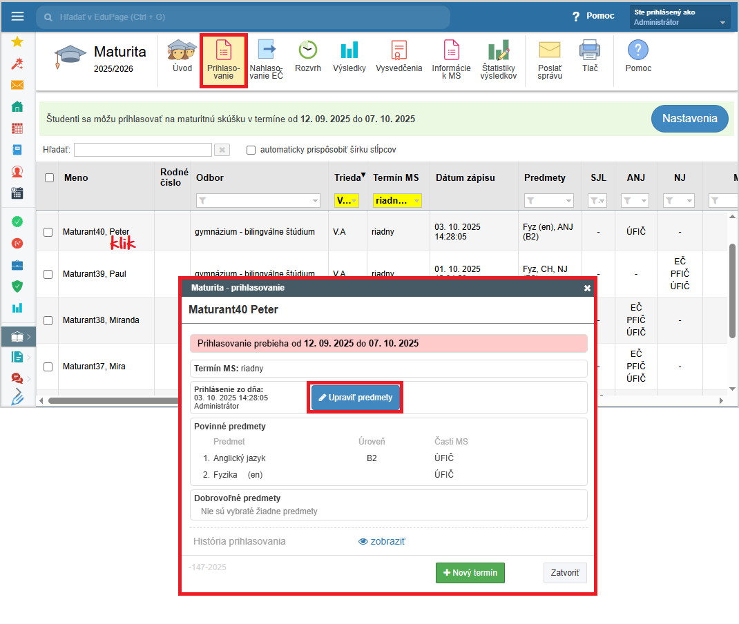 Poznámka : Administrátor vie upraviť študentom prihlásené predmety aj po ukončení termínu prihlasovania.