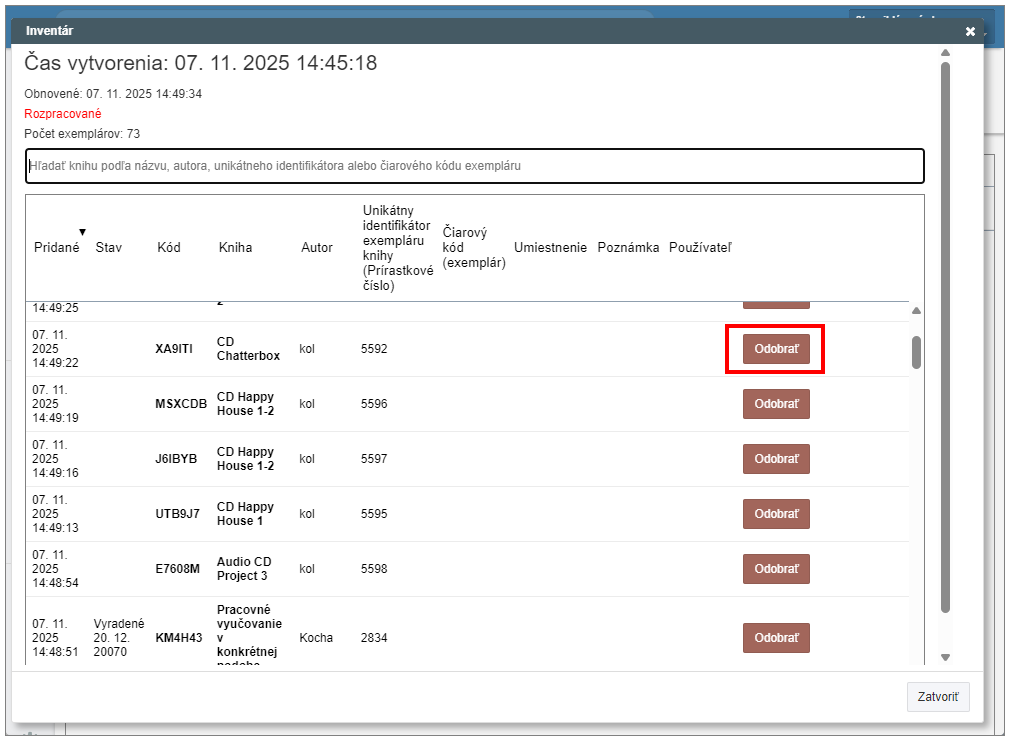 V prípade, že je kniha po zápise do inventarizačného zoznamu vyradená, alebo vymazaná, zobrazí sa táto informácia, vrátane dátumu, pri inventarizovanej knihe. Informácia sa zobrazí aj pri knihe v zatvorenom zozname. Exemplár viete zo zoznamu odobrať stlačením “Odobrať”.