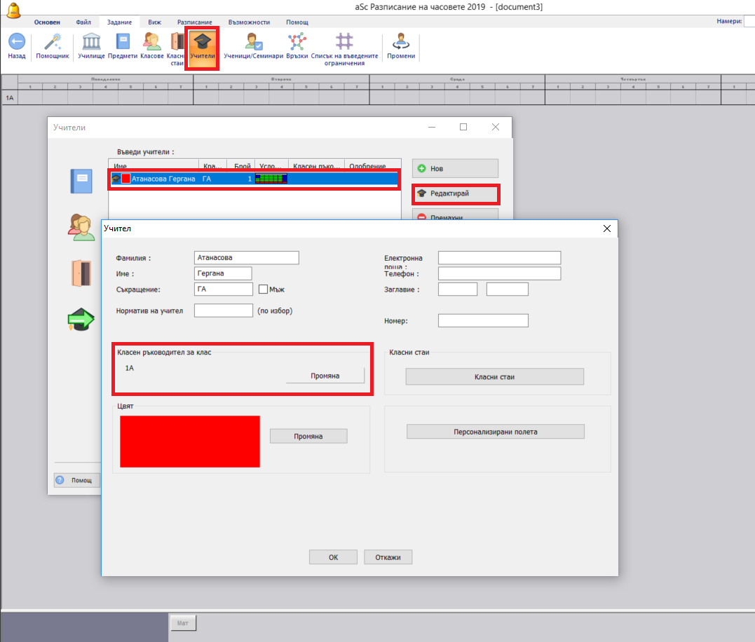 Забележка: Имената на класните ръководители се принтират в горния десен ъгъл на седмичното разписание на класа.