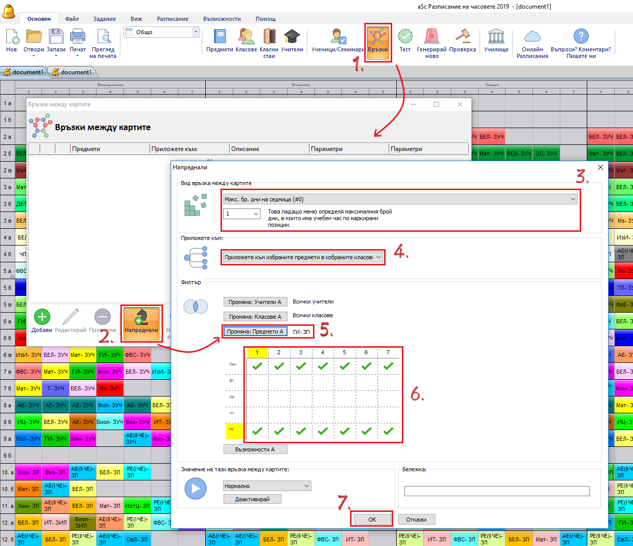 Програмата автоматично поставя вашите часове равномерно през цялата седмица, не в последователни дни. Но по подразбиране петък и понеделник не са последователни дни. Ако не желаете да имате часове в петък и след това в понеделник, трябва да обозначите разширена връзка в картата.