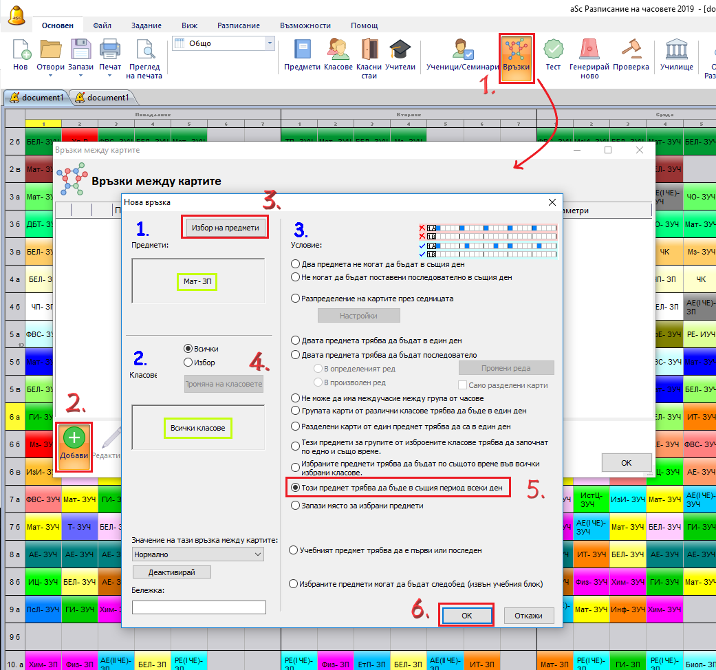 Разширено използване: В някои случаи може да се наложи да използвате разширена връзка в картата. Например, ако един клас има 2 часа Английски език с учител А и 3 часа разговорен Английски език с учител Б и желаете и двата учебни предмета да са по едно и също време всеки ден - Използването на разширените връзки в картата е както следва: