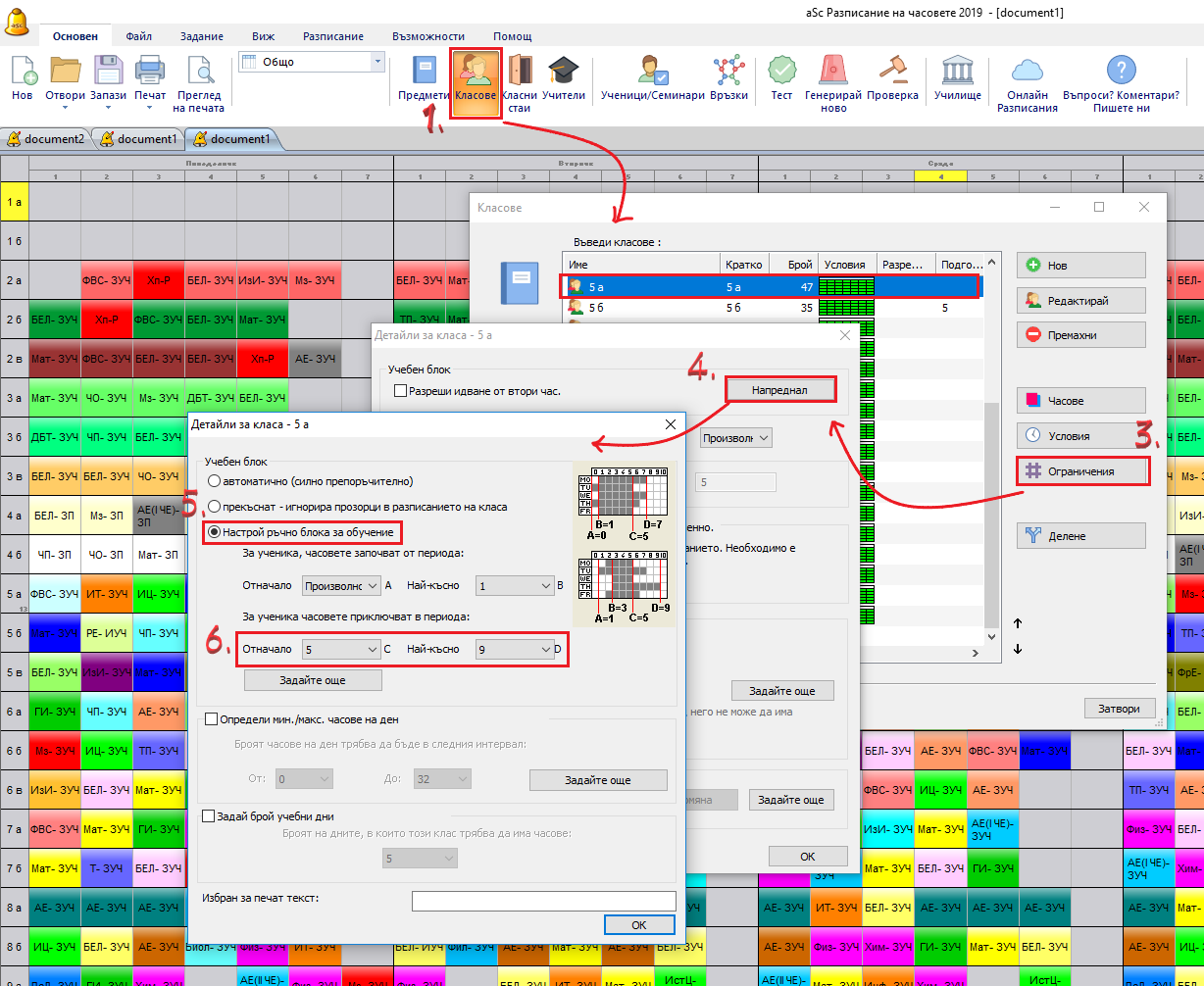 Също така софтуерът започва с първи час и попълва блока от учебни часове за всеки клас, докато изчисли максимума на ден.