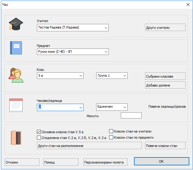 7. Ще открием, че за този час изискването е да се провежда само в несподелена класна стая. The problem is that this is a divided lesson and the only lessons that can run at the same time also have to be in the home classroom.
