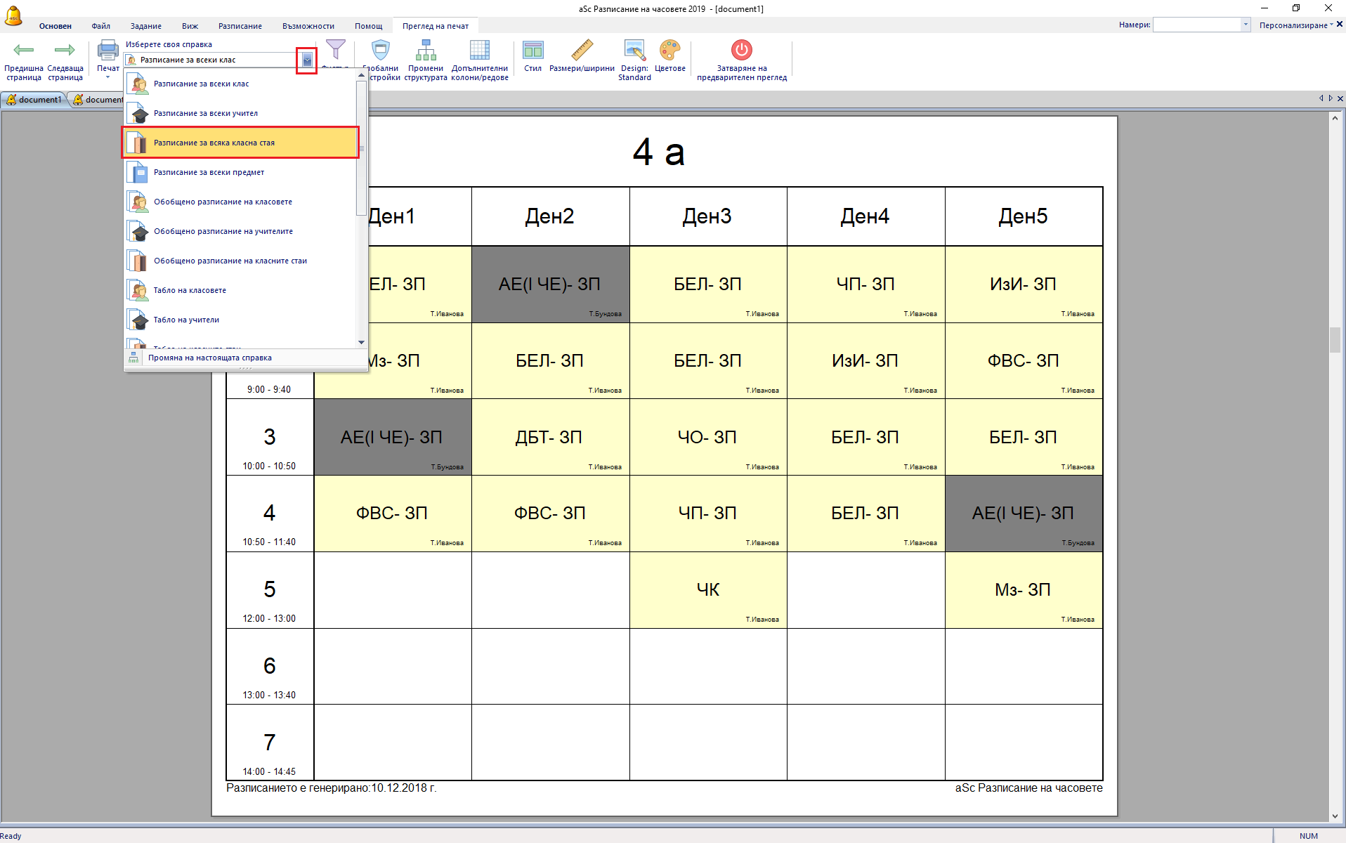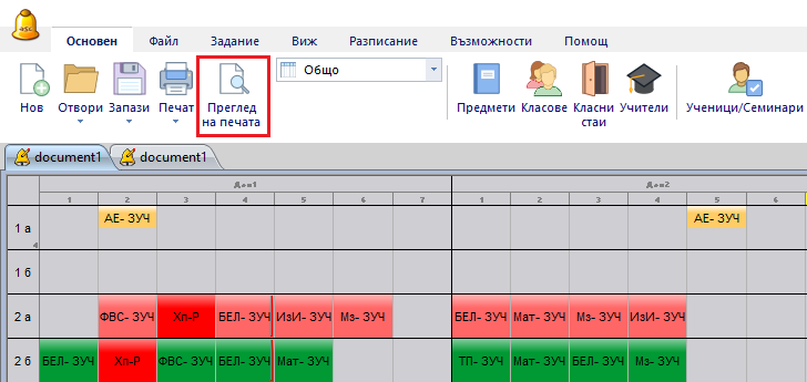 Забележка: ако използвате семинари, тогава може да нямате индивидуални ученици в софтуера, а само групи. В този случай можете само да принтирате разписанието на целия клас.