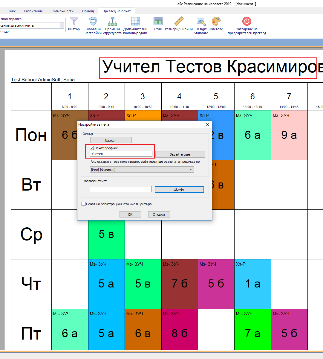 Искам да принтирам обобщено разписание на учителите с техните цветове