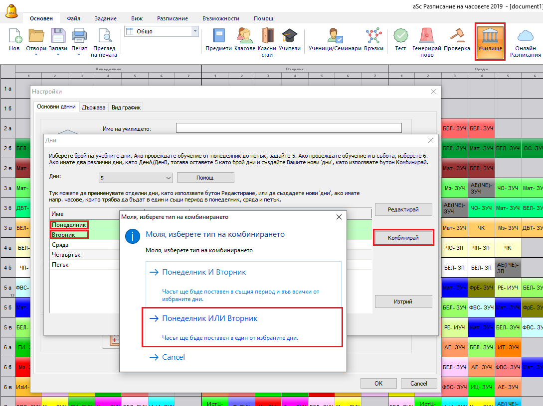 Трябва да отидете в меню „Училище/ Дни/ Комбинирай“ и да създадето нова елемент