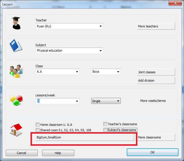 Let' say you have more classrooms for your Physical Education lessons (few Gyms with different sizes -"big and small" , Playground for outdoor activities, Fitness gym with specific equipment in the school basement).